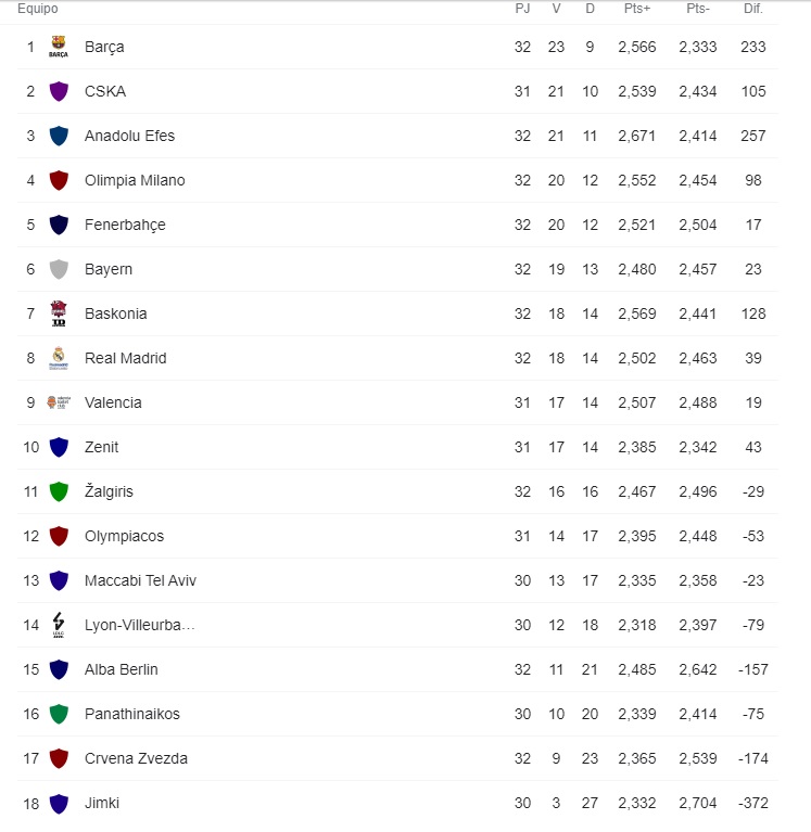 A falta de dos jornadas para el final, el Real Madrid es octavo y tiene un balance de 18 victorias y 14 derrotas. Las mismas que el Baskonia. Zenit y Valencia llevan 17 y 14 pero ambos han disputado un partido menos. Los de Pablo Laso tienen el average ganado con el equipo ruso pero perdido con los dos equipos españoles. Sin embargo, hay un duelo entre el Valencia y Baskonia el 8 de abril, en la última jornada de la fase regular.