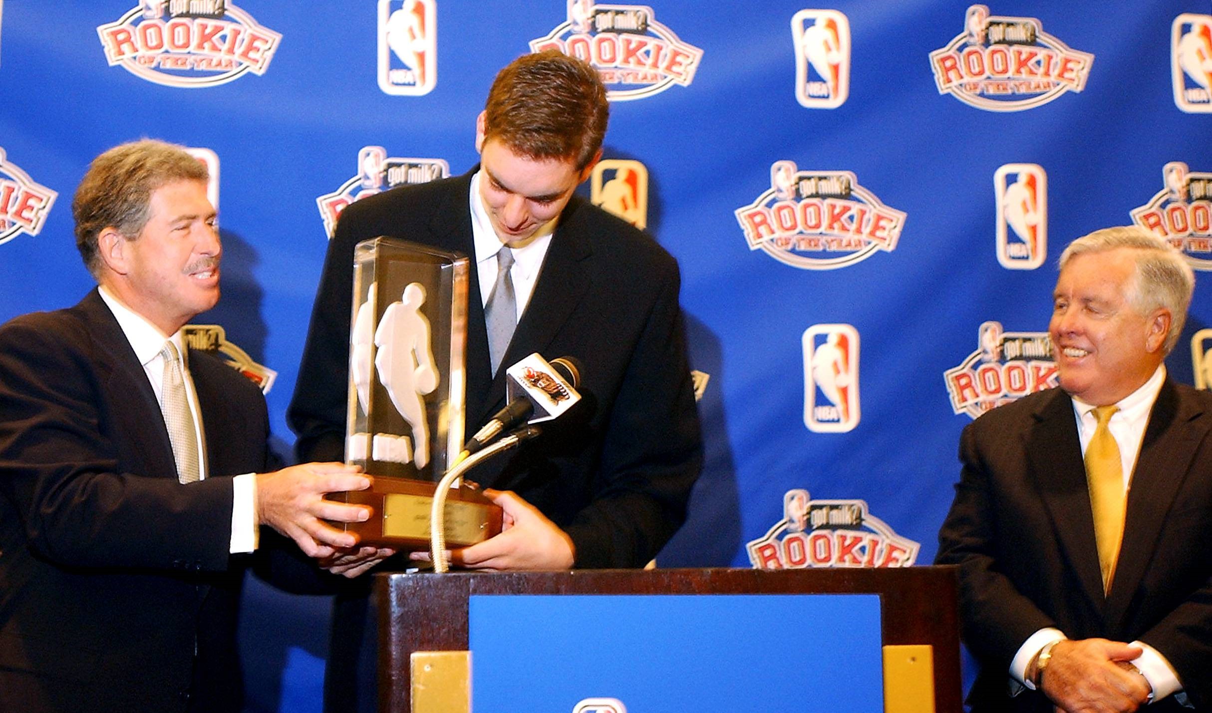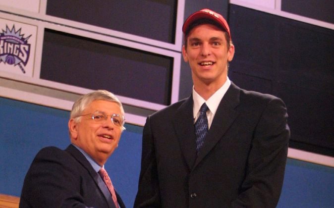 Pau Gasol aterrizó en la mejor liga el 27 de junio de 2001 con su elección como número 3 del draft por los Atlanta Hawks (en la imagen, el de Sant Boi aparece con el excomisionado David Stern). Instantes después a su elección, Gasol fue traspasado junto con Lorenzen Wright y Brevin Knight a Memphis Grizzlies a cambio de los derechos del entonces jugador franquicia Shareef Abdur-Rahim y la elección 27 en el draft de 2001, Jamaal Tinsley.