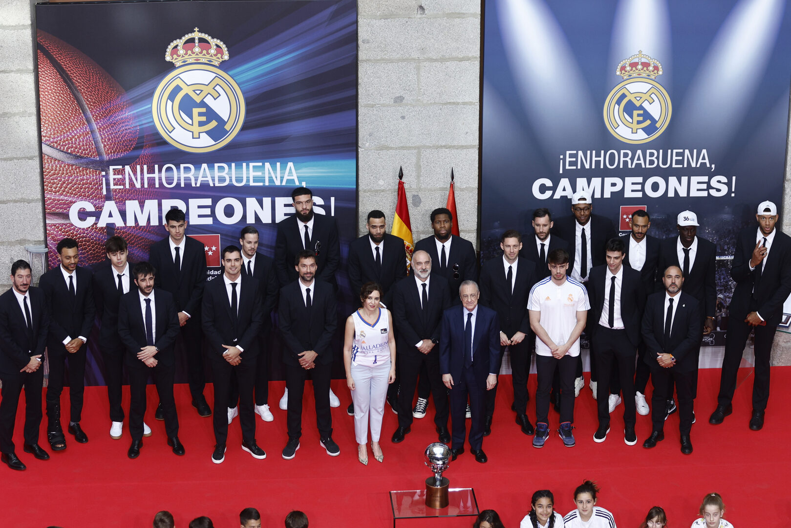 La presidenta regional recibió a la plantilla y la directiva del Real Madrid tras su victoria en la Liga Endesa al superar en la final al Barça.