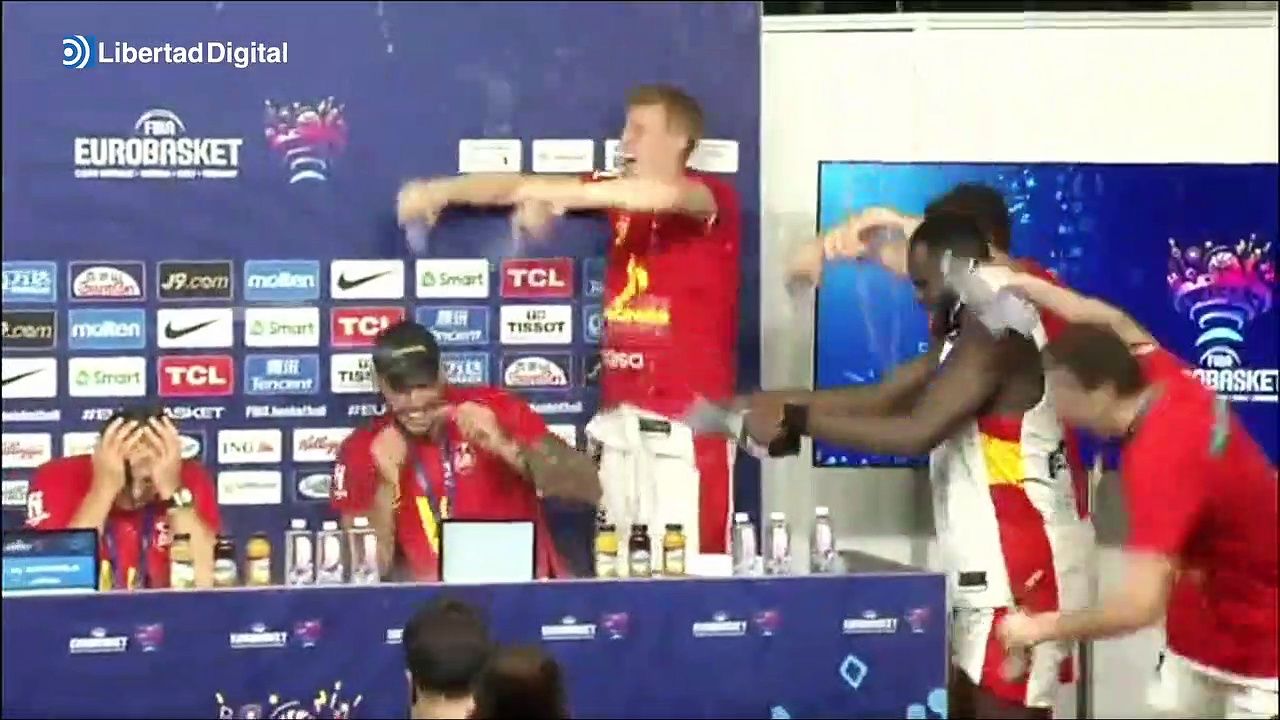 Era casi inevitable que la euforia se trasladara por todos los rincones de Berlín. Tras la victoria de España ante Francia en la final del Eurobasket (88-76), la alegría de los chicos de Scariolo se desbordó sin contemplaciones y llegó incluso a la rueda de prensa del partido. El seleccionador Sergio Scariolo y Willy Hernangómez acabaron empapados de agua cuando atendían a los periodistas. Al grito de "¡Campeones de Europa!", la gran familia española celebró a lo grande un triunfo en el que muy pocos creían, con un equipo en transición lleno de diamantes en bruto.
