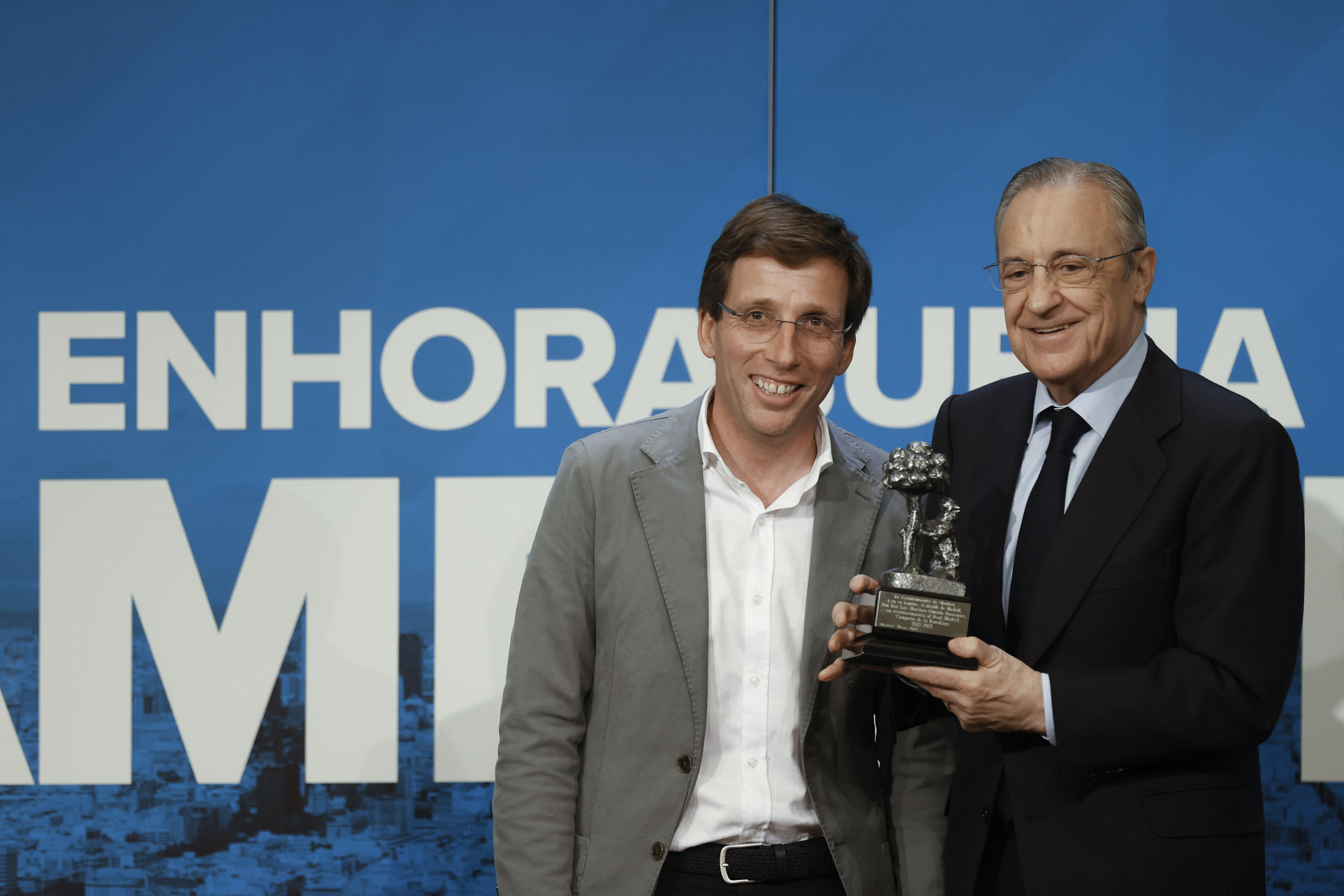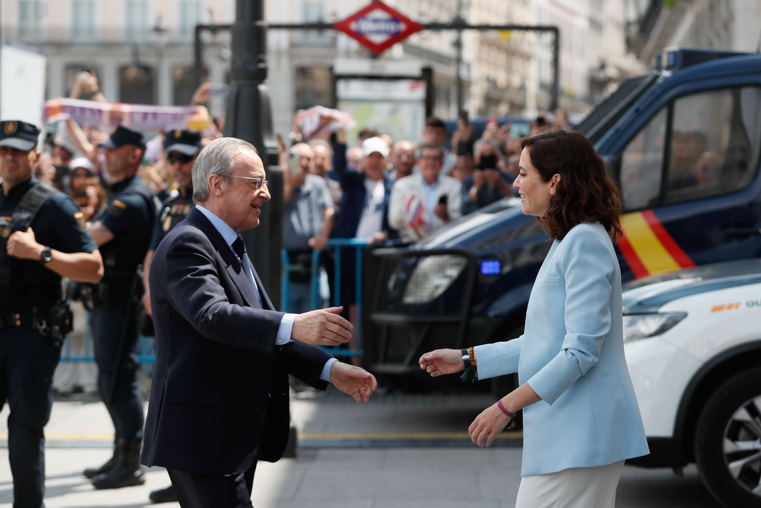 La presidenta de la Comunidad de Madrid, Isabel Díaz Ayuso, ha recibido a Florentino Pérez, presidente del Real Madrid, en la Puerta del Sol. Saludo cordial entre ambos.