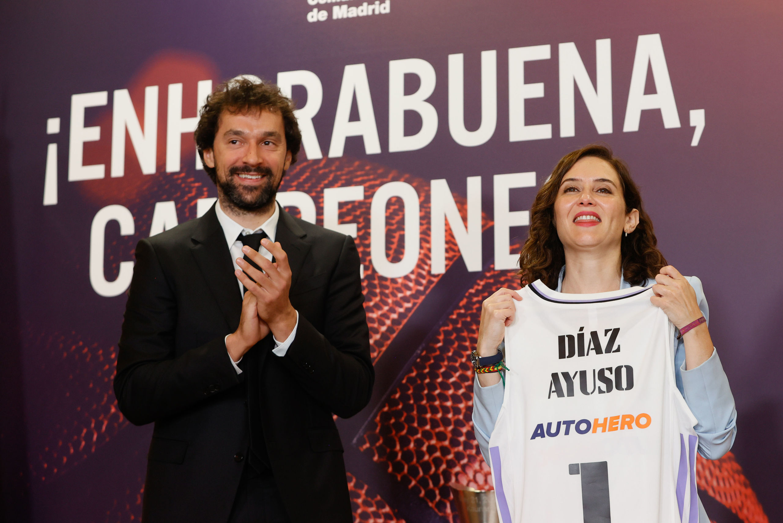 Como viene siendo habitual en este tipo de recibimientos, la presidenta de la Comunidad de Madrid recibió una camiseta del Real Madrid de baloncesto con su nombre: Ayuso.