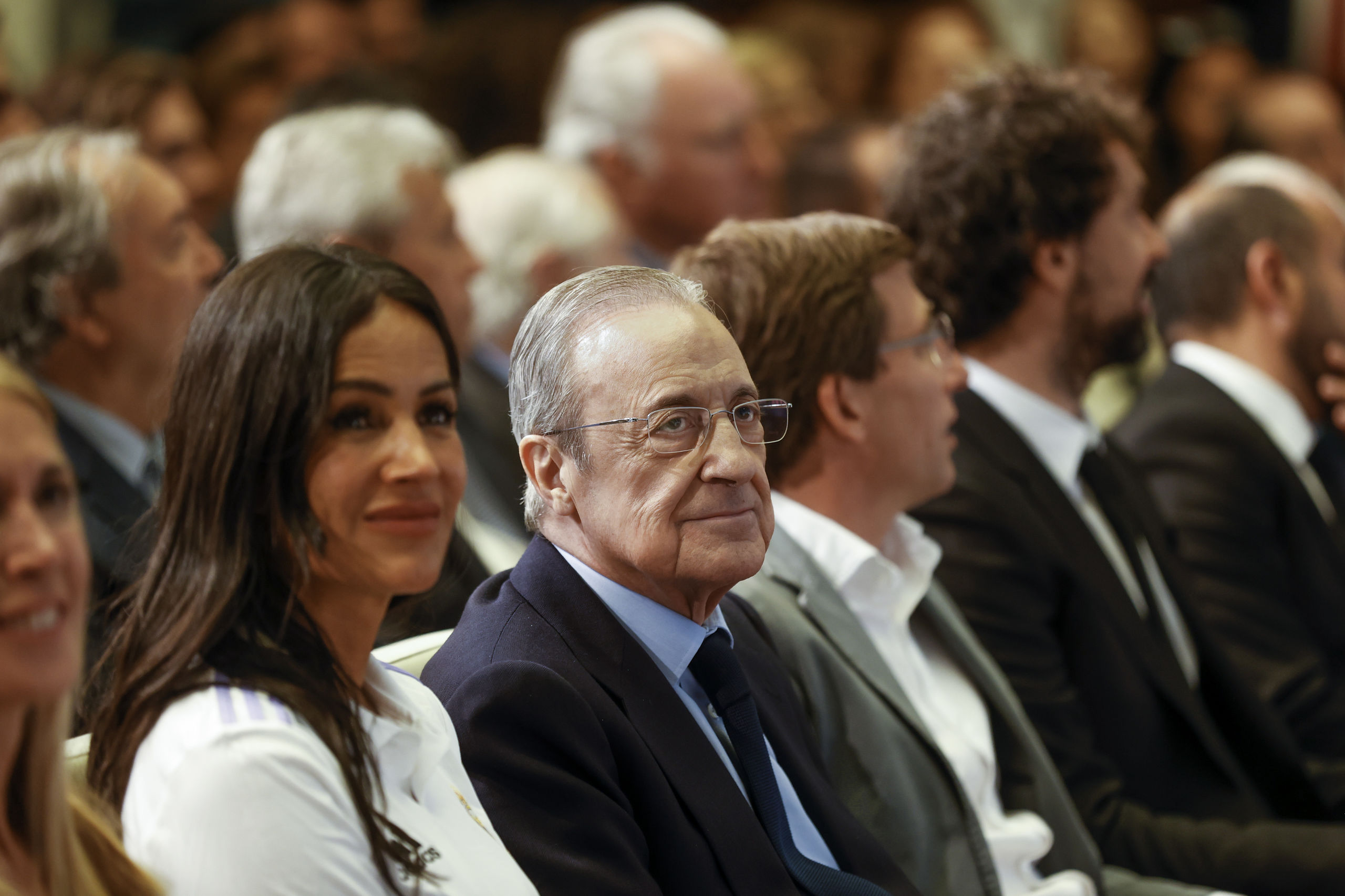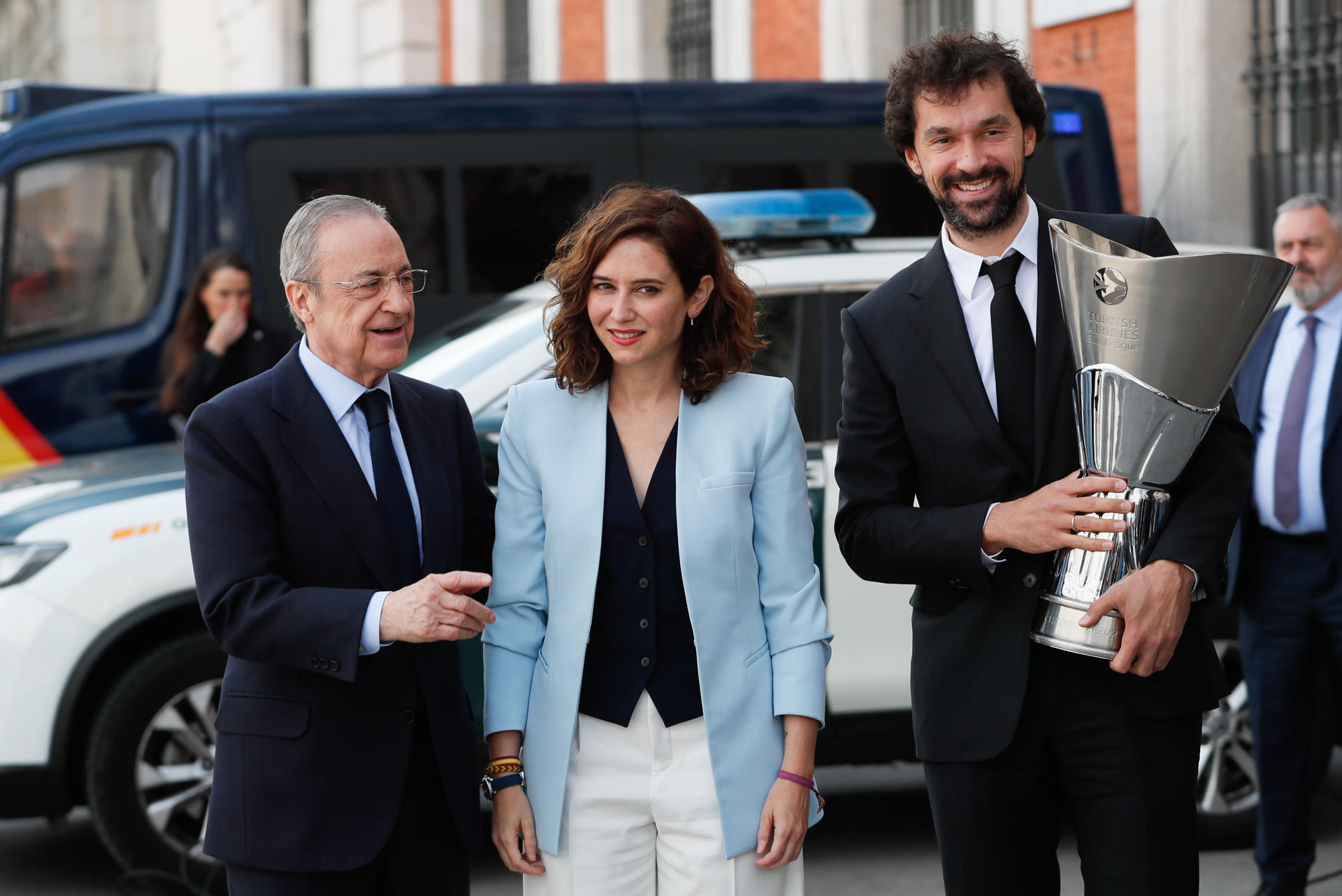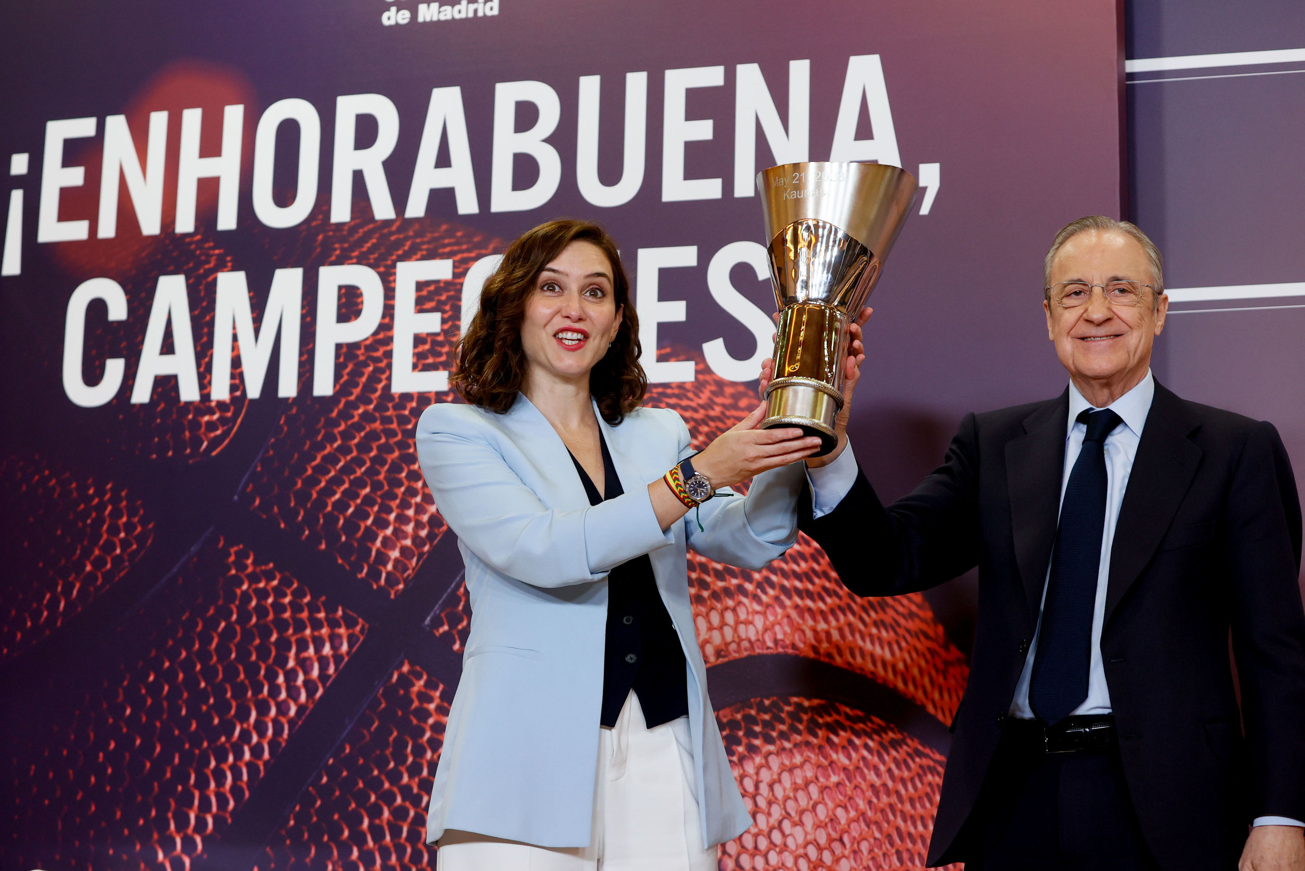 Florentino Pérez e Isabel Díaz Ayuso se saludaron en primer lugar antes de que los jugadores blancos fueran bajando uno a uno del autobús de campeones de la Euroliga.