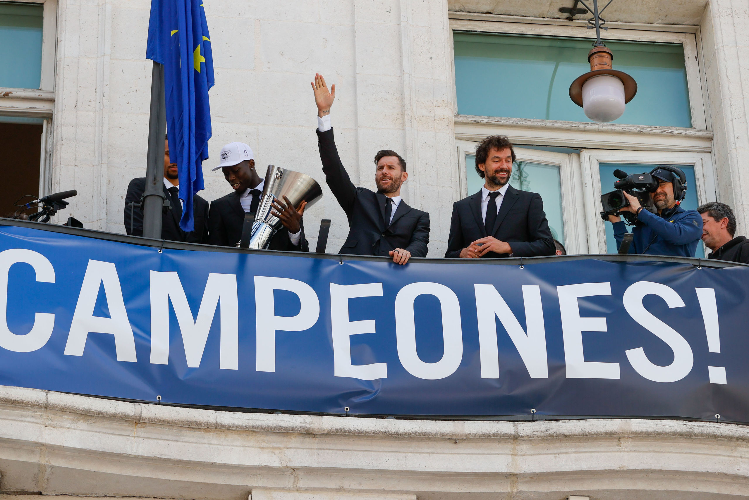 Otro de los actos habituales en este tipo de celebraciones es el saludo a la afición desde el balcón. El público de la Puerta del Sol disfrutó con sus campeones.
