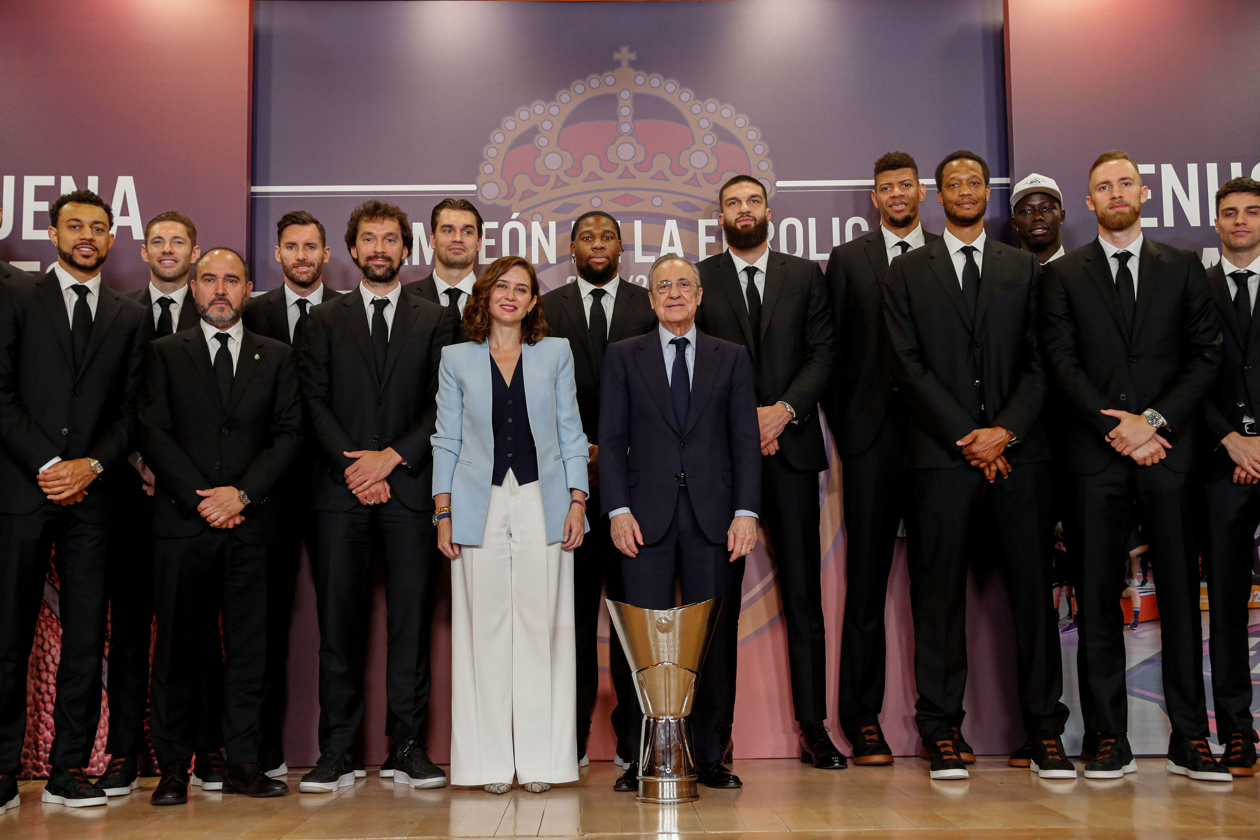 Ayuso posó con toda la plantilla del Real Madrid y junto al presidente de la entidad, Florentino Pérez.