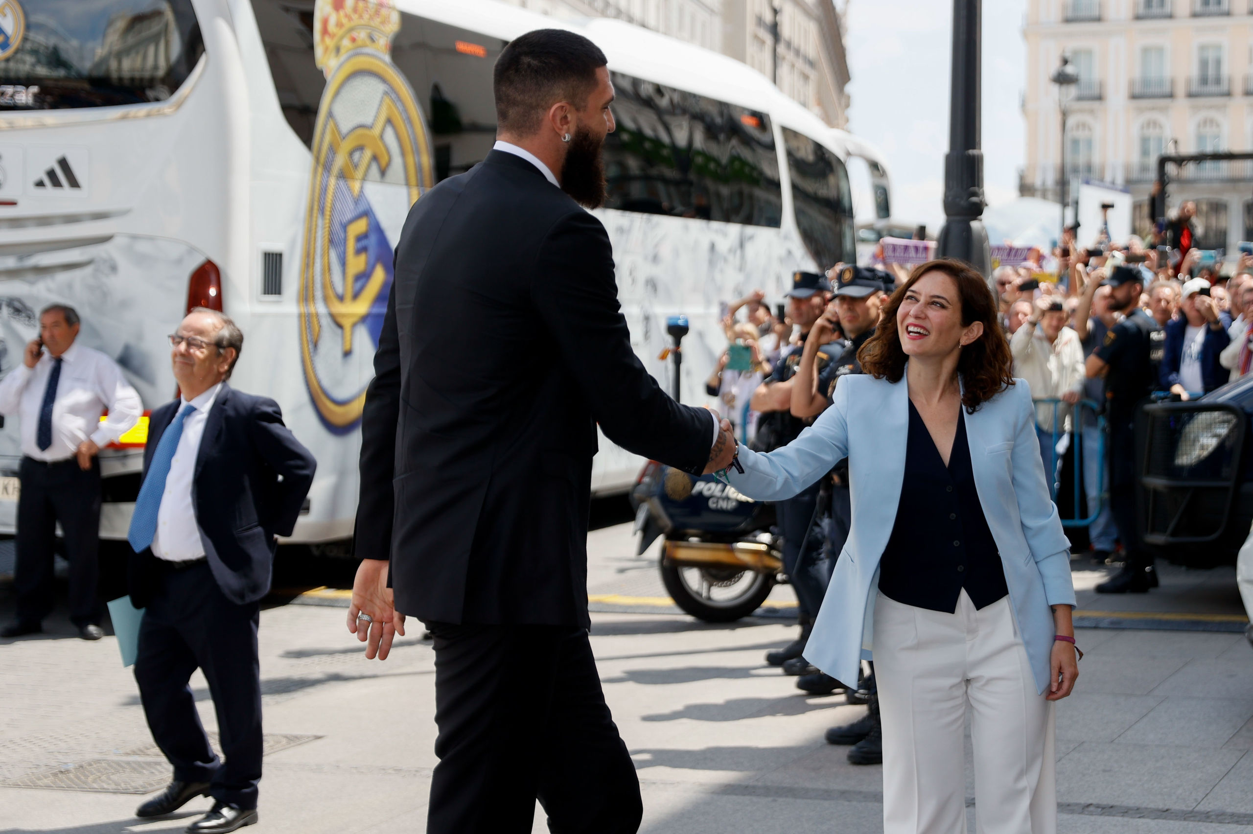Las imágenes del recibimiento de Ayuso al Real Madrid con guiño a Vinícius