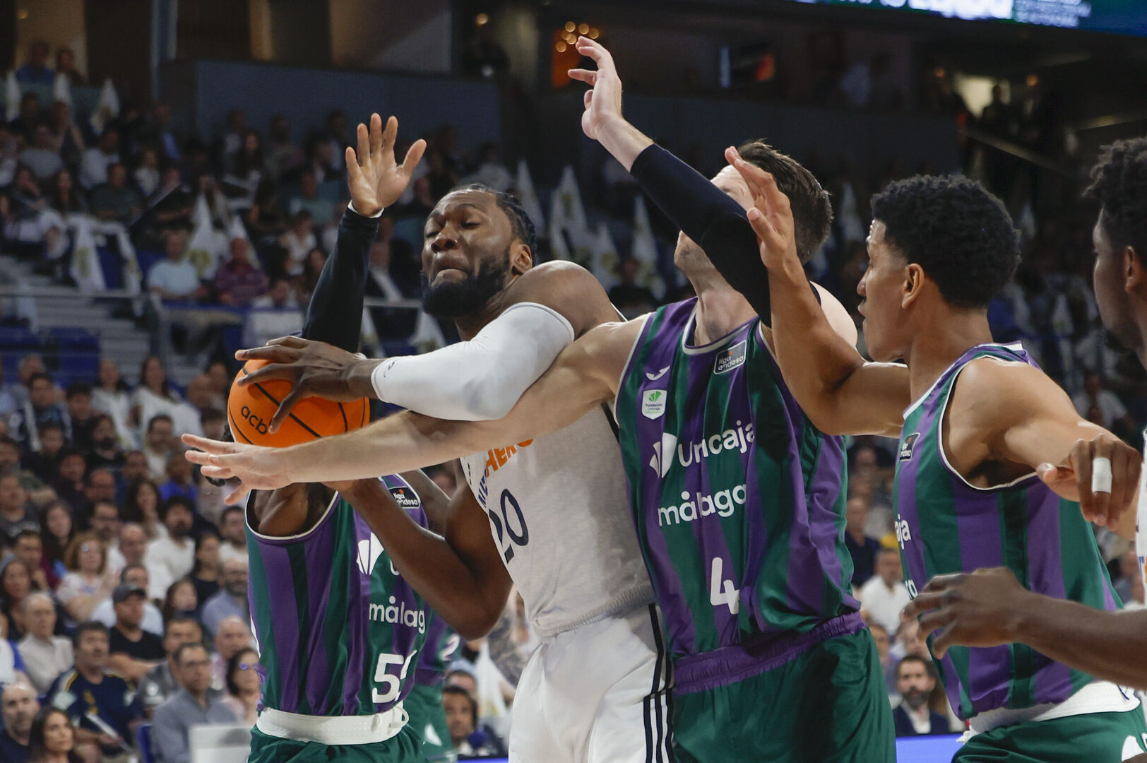 Con dos canastas, triple incluido, Ejim devolvió la amplitud en su renta (31-21) a un Unicaja que quería correr, quería agradar a su gente y quería imprimir su habitual ritmo alto a un partido de todo o nada para sus intereses. Musa emergió junto a Hezonja para hacer la 'goma' por parte merengue, pero Osetkowski logró dos triples muy jaleados. Yendo 43-33 abajo, el equipo visitante se encomendó a veteranos. Todo en ataque pasaba por manos de Hezonja y además Llull coló un canastón con paso hacia atrás y apoyando su tiro en tablero, que puso el 43-39 a 2.0 para el descanso. Tras el último saque de banda, Alberto Díaz hizo una 'pared' con Killian Tillie, pero su triple sobre la bocina no entró.
