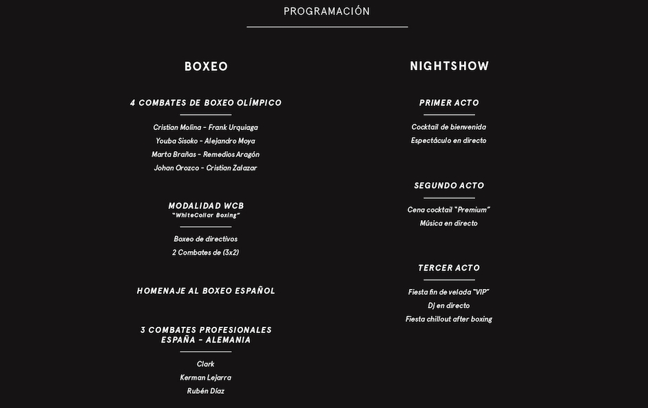 Un evento que comenzará a las 19:30 horas con el acceso al recinto, photocall y un cocktail. La velada arrancará con la música de los dj Alex DC y Miki Pavón. A las ocho y media, la conocida presentadora Silvia Jato será la encargada de presentar la gala y a continuación comenzarán cuatro combates olímpicos: Cristian Molina vs. Frank Urquiaga, Youba Sisoko vs. Alejandro Moya, Marta Braños vs. Remedios Aragón y Johan Orozco vs. Cristian Zalazar.
