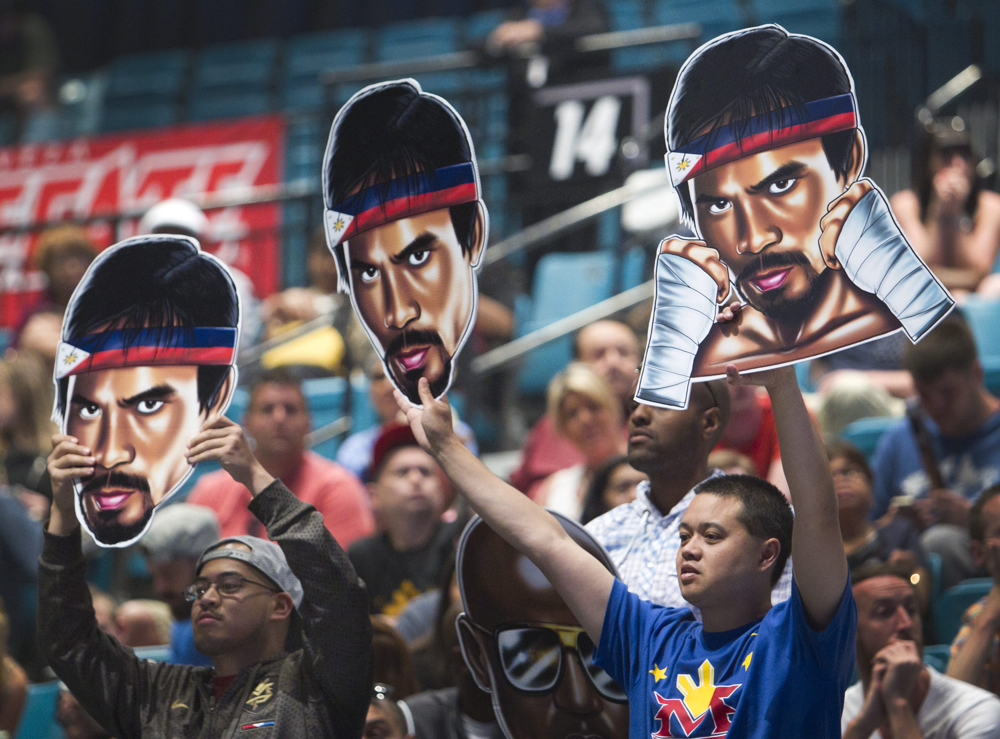 Los fans de Pacquiao lucen máscaras con la cara del filipino.