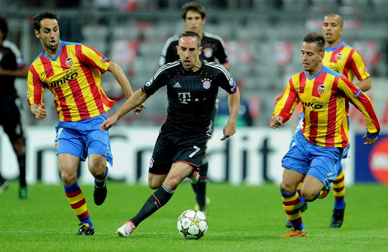 El Bayern encontró el premio a su insistencia antes del descanso. Schweinsteiger recibió un buen balón por la derecha y batió a Alves con un remate seco y cruzado. El portero brasileño tocó la pelota, pero no lo suficiente para haberla desviado lejos de su portería. El Valencia perdía demasiado el balón y se veía a merced de los bávaros. Sólo Feghouli puso algo de chispa al ataque visitante, aunque su velocidad no bastó para sorprender a Dante, el lateral izquierdo del Bayern, mientras que Soldado era una isla arriba.