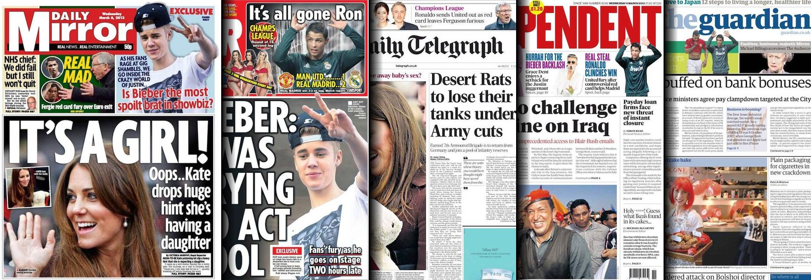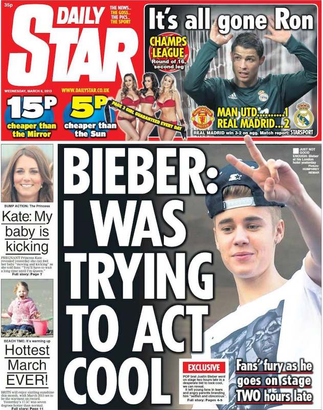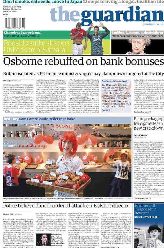 Los diarios británicos recogen en sus portadas la victoria del Real Madrid ante el Manchester United en Old Trafford (1-2), en la vuelta de octavos de final de la Liga de Campeones, y hacen hincapié en la actuación del colegiado Cuneyt Çakir al expulsar, a su parecer "injustamente", a Nani con más de media hora por delante.