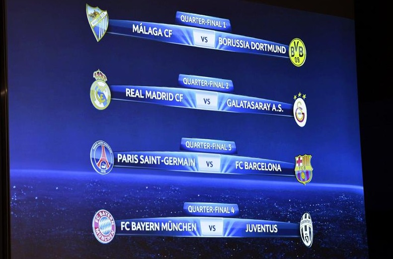 Borussia Dortmund, Galatasaray y París Saint-Germain serán los rivales del Málaga, Real Madrid y FC Barcelona, respectivamente, en los cuartos de final de la Liga de Campeones, según el sorteo celebrado este viernes en la sede de la UEFA en la ciudad suiza de Nyon.