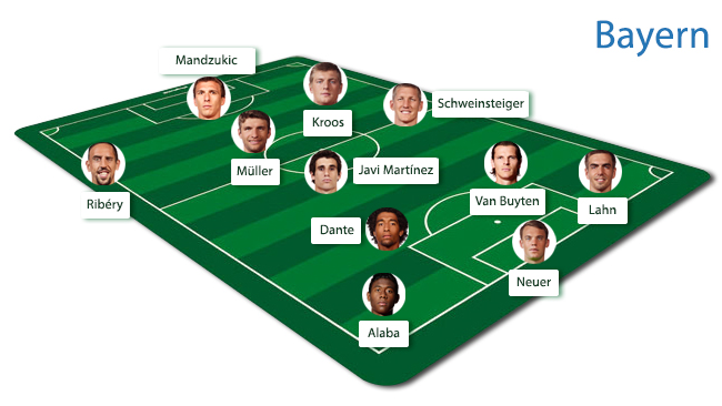 Sólido como él solo, el cuadro muniqués cuenta con un gran centro del campo, con Schweinsteiger y Javi Martínez –fichado el pasado verano al Athletic de Bilbao por 40 millones de euros– moviendo al equipo, mientras que Ribéry y Robben –éste suplente en los últimos tiempos– son auténticos puñales por las bandas. Sin olvidar a dos mediapuntas de gran clase mundial como Thomas Müller y Toni Kroos, aunque éste no volverá a vestirse de corto hasta la próxima temporada al lesionarse de gravedad en el partido de ida ante la Juventus.