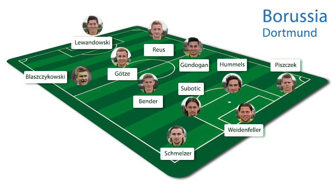 A partir de aquí, del medio campo para arriba, llega la calidad. El Borussia se distingue por un fútbol directo y letal gracias al toque rápido de sus centrocampistas como Ilkay Gündogan, Sebastian Kehl, Bender y, con menor protagonismo, el exmadridista Nuri Sahin. Son los escuderos de dos de las principales estrellas del equipo: los internacionales alemanes Mario Götze y Marco Reus.