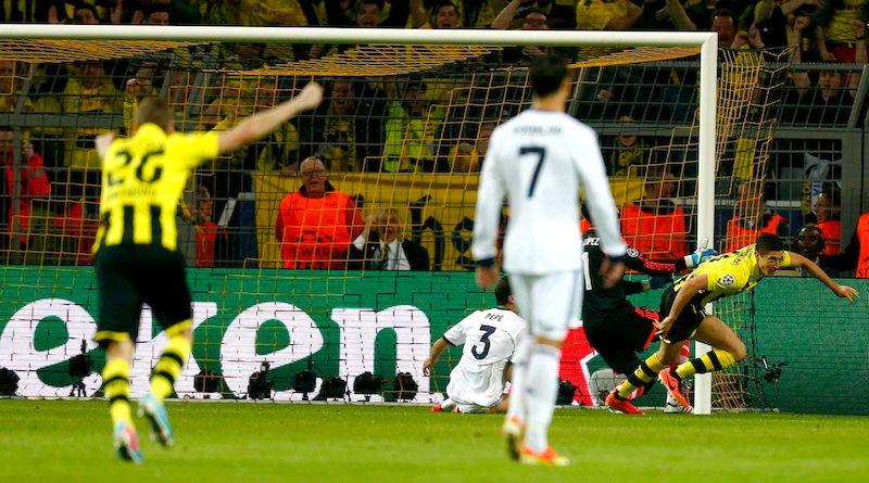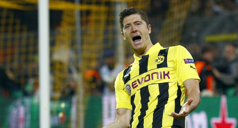 Robert Lewandowski, autor de los cuatro goles del Borussia, fue el mejor jugador del partido. En la imagen, el delantero polaco celebra su cuarto tanto al batir a Diego López con un lanzamiento de penalti.