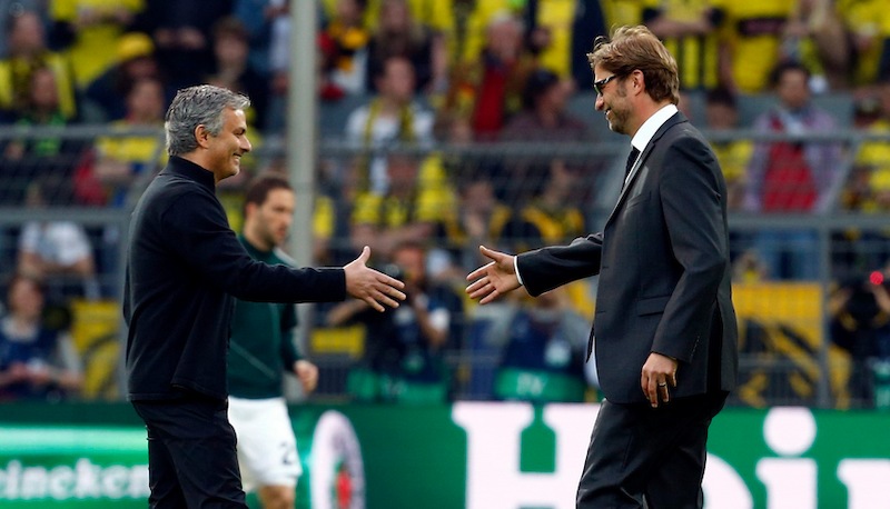 El técnico del Real Madrid, José Mourinho, saluda a su homólodo del Dortmund, Jürgen Klopp.