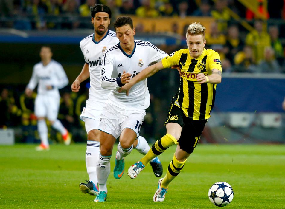 El alemán Marco Reus fue una pesadilla para la defensa blanca. En la imagen, el centrocampista se lleva la pelota ante sus compatriotas Mesut Özil y Sami Khedira.