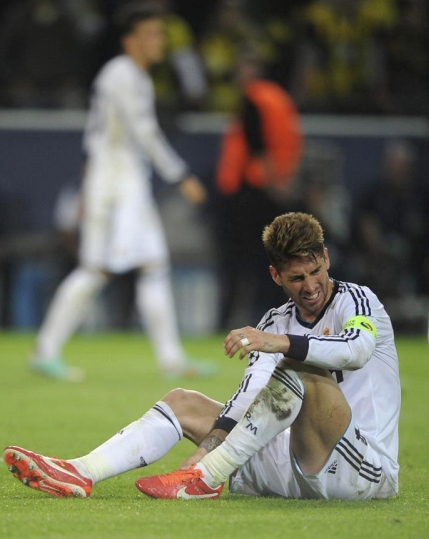 Sergio Ramos se lamenta sobre el césped del Signal Iduna Park tras la derrota del Real Madrid ante el Borussia Dortmund (4-1), en la ida de semifinales de la Champions.