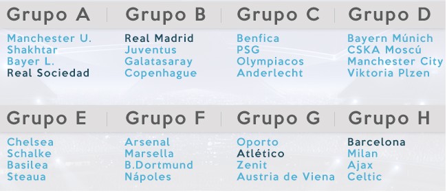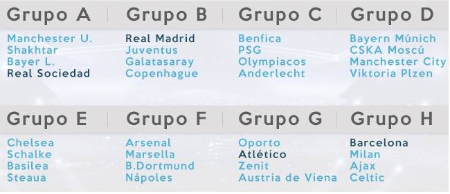 El actual campeón, el Bayern Múnich, estará en el D junto a CSKA Moscú, Manchester City y Viktoria Plzen, mientras que la igualdad parece garantizada en el F, compuesto por Arsenal, Marsella, Borussia Dortmund y Nápoles, y en el C, formado por Benfica, París Saint Germain, Olympiacos y Anderlecht.