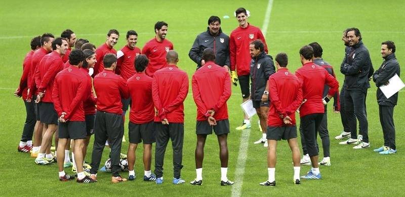 Su puesto en el once será para Raúl García, una de las novedades de la alineación, en la que el técnico está pendiente del uruguayo Diego Godín, con un leve esguince de rodilla, aunque ha viajado a Portugal con el equipo. Si no está para jugar, su compatriota José María Giménez o el belga Toby Alderweireld son las opciones. En el centro de la defensa es fijo el brasileño Joao Miranda, al igual que el belga Thibaut Courtois en la portería. El guardameta, con un golpe en el dedo índice de su mano izquierda desde el derbi del sábado, estará listo para el encuentro y ocupará la meta del Atlético, protegido en las bandas por Juanfran Torres y Filipe Luis.