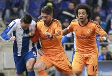 Sergio Ramos (c) pelea por el balón con Sergio García (i) en el partido ante el Espanyol. | EFE