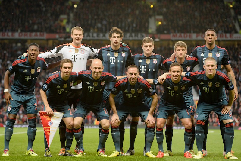 Neuer en portería y defensa de cuatro para Lahm y Alaba en los laterales que, cuando atacan, suben líneas y ocupan el pivote y el interior izquierdo, respectivamente, con Javi Martínez y Boateng solos cerrando. Acaba siendo defensa de dos, que solventan rápido Alaba y Lahm gracias a su velocidad. Por delante, el espectáculo hecho fútbol. Schweinsteiger de manija, con Kroos justo por delante. A banda cambiada la pareja Robbery: el galo, diestro, parte desde la izquierda; el holandés, zurdo, desde la derecha. Y no siempre tienden al tiro, pues la asistencia con su pierna menos mala no es nada extraño. Y arriba, de falso 9, sin ser el Messi que Pep tenía en el Barcelona, Müller.