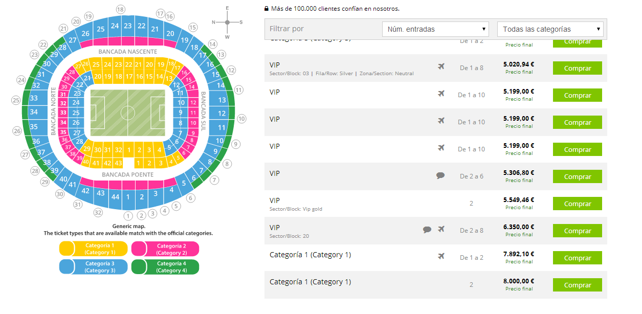 Éste es el precio más alto que se registra tras haber consultado algunas páginas de Internet de compra-venta entre particulares, como son tengoentradas.com, ticketbis.com o seatwave.es, donde aparecen precios que oscilan desde los 850 hasta la mareante cifra de 8.000 euros. Aunque otra opción, por dos asientos de "Categoría 2" (los de 280 euros) alcanza los 15.000 euros. Eso sí, dice su vendedor, anónimo en este tipo de negocios hasta que se alcanza el acuerdo por Internet, que se venden de manera conjunta.