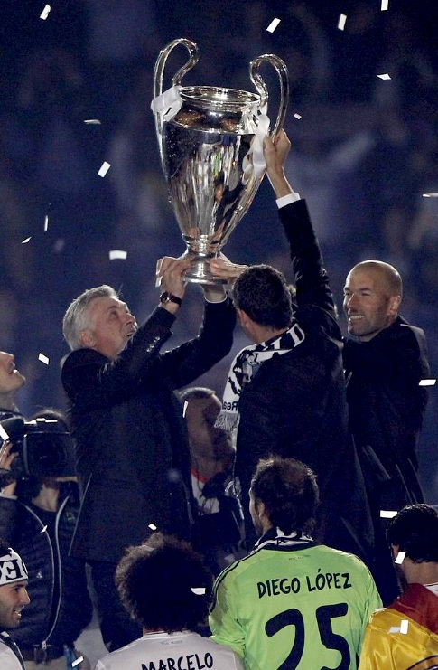 Carlo Ancelotti (i) levanta la Copa de Europa junto a sus dos ayudantes en el banquillo: Paul Clement y Zinedine Zidane.