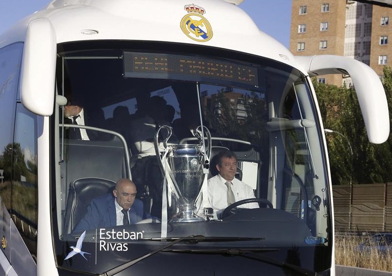 Momento en el que el autobús con la expedición madridista sale de la Ciudad Deportiva de Valdebebas.