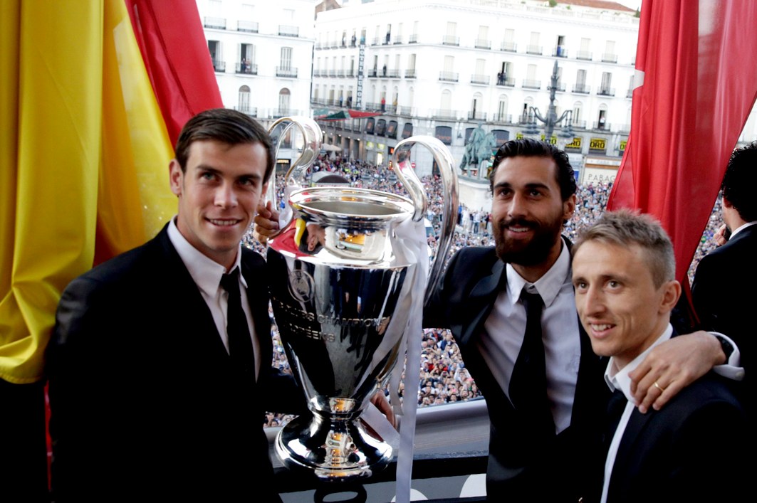 Gareth Bale, Álvaro Arbeloa -con una poblada barba- y Luka Modric -que se ha cortado el pelo y ya no luce melena-, junto a la Copa.