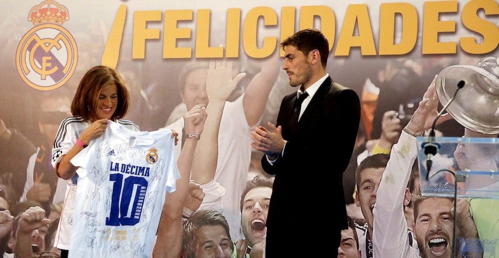 Ana Botella, vistiendo la elástica madridista y con una camiseta de la Décima en presencia de Iker Casillas.