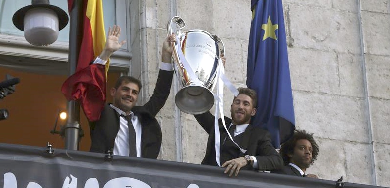 Iker Casillas, Sergio Ramos y Marcelo muestran el trofeo a la afición desde el balcón de la sede de la Comunidad.