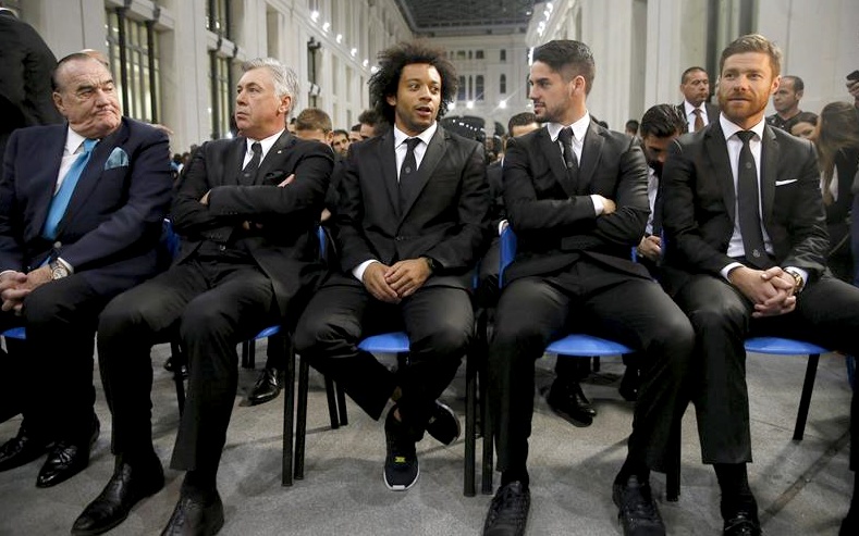 En primera fila, escuchando los discursos de Ana Botella y Florentino Pérez, se pudo ver a Fernando Fernández Tapias, Carlo Ancelotti, Marcelo, Isco Alarcón y Xabi Alonso.