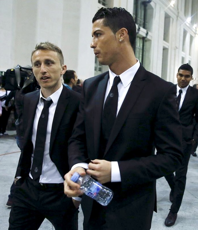 Cristiano Ronaldo, que prefirió mantenerse en un segundo plano, conversa con Luka Modric en el Ayuntamiento de Madrid.