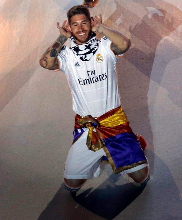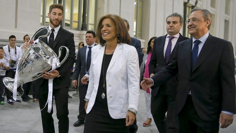 Sergio Ramos sostiene la Copa en presencia de la alcaldesa de Madrid, Ana Botella, y Florentino Pérez.