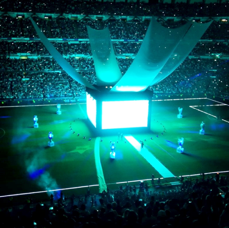 Así lucía el césped del estadio Santiago Bernabéu, con nueve de las Copas de Europa conquistadas hasta ahora y esperando a la Décima, que portaron los miembros del equipo.