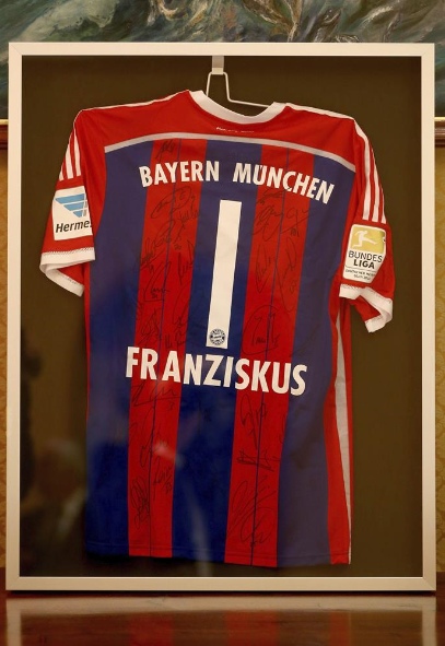 La especial camiseta que el Bayern de Múnich ha regalado a Francisco I, con su nombre en alemán y la firma de todos los jugadores.