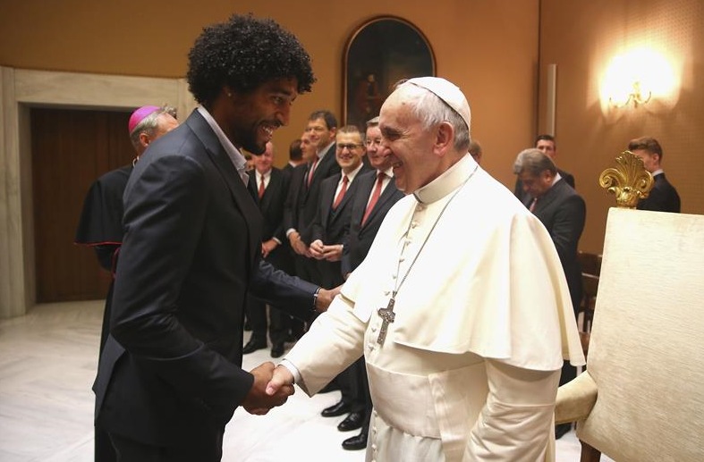 Su Santidad saluda al defensa brasileño Dante, que estuvo en el banquillo de los suplentes y no jugó un solo minuto.