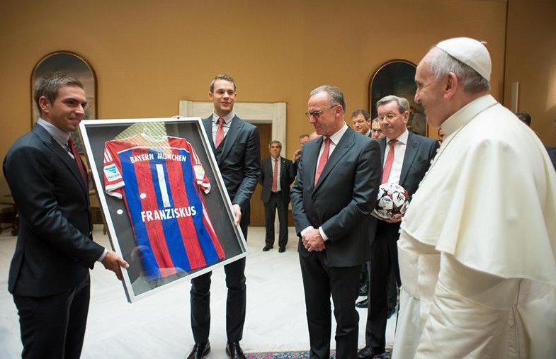 Philip Lahm, como capitán del Bayern, entrega al Papa una camiseta especial del Bayern con su nombre.