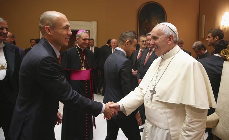Arjen Robben, autor de dos de los siete goles que el Bayern endosó a la Roma en el Olímpico (1-7), recibió la felicitación de Su Santidad.
