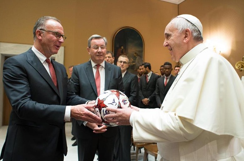 El Papa Francisco saluda en el Vaticano a Karl-Heinz Rummenigge, presidente del Bayern de Múnich. "Yo te vi jugar la final del 86", le ha dicho el pontífice al exjugador, en alusión al duelo que Argentina ganó a Alemania en México.