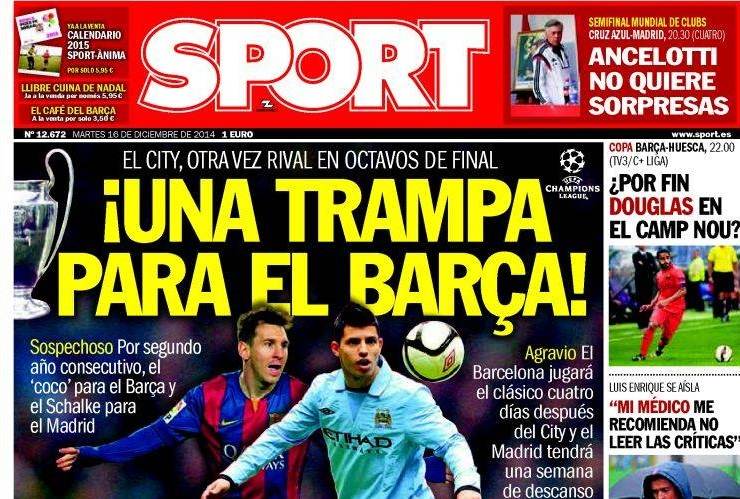 Después de que el sorteo de los octavos de final de la Liga de Campeones emparejará al FC Barcelona con el Manchester City y al Real Madrid con el Schalke 04, el diario deportivo catalán Sport ha asegurado en su portada que el resultado del sorteo es "sospechoso", después de repetirse los cruces que tuvieron lugar el año pasado para blancos y azulgranas.