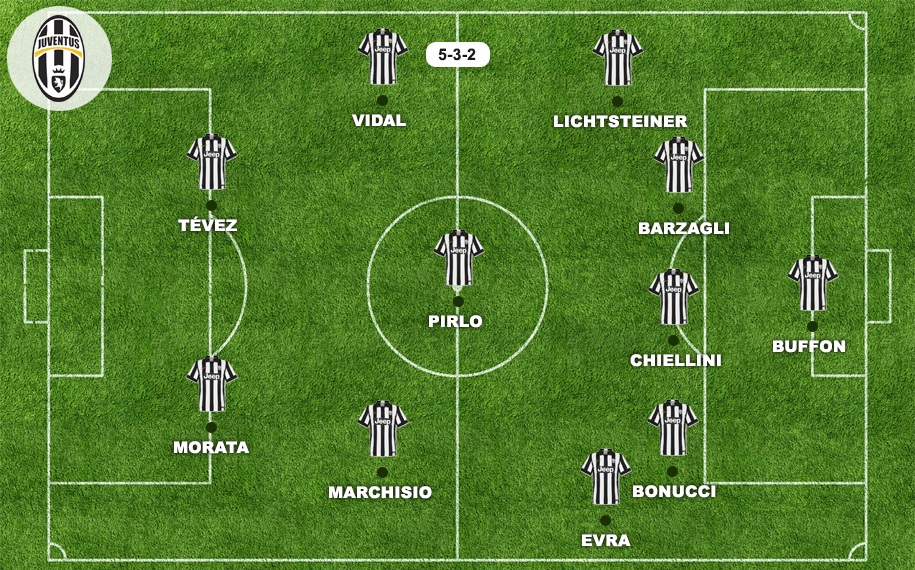 Allegri, tras probar el 4-4-2, recuperó pronto el dibujo que implantó Conte y que tantos éxitos le ha dado en Italia en los últimos años: 3-5-2. Cuando tiene el balón, Lichtsteiner y Evra adelantan su posición y se sitúan a la altura de la línea de tres centrocampistas. Cuando ataca el rival, el galo y el suizo acompañan a los tres centrales formando una línea de cinco atrás. En algunos partidos contra rivales más asequibles, Allegri rescata el 4-4-2.
