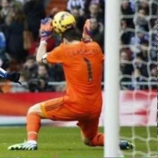 Últimos instantes de la ida de semifinales de la Champions. Juventus vs. Real Madrid. Fernando Llorente remata flojita una falta lateral con la cabeza, y Casillas atrapa un balón manso y débil. Juan Carlos Rivero, el narrador, comenta: "Parada milagrosa de Casillas".