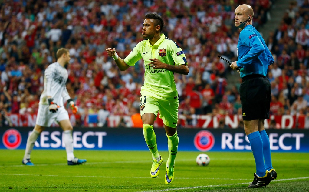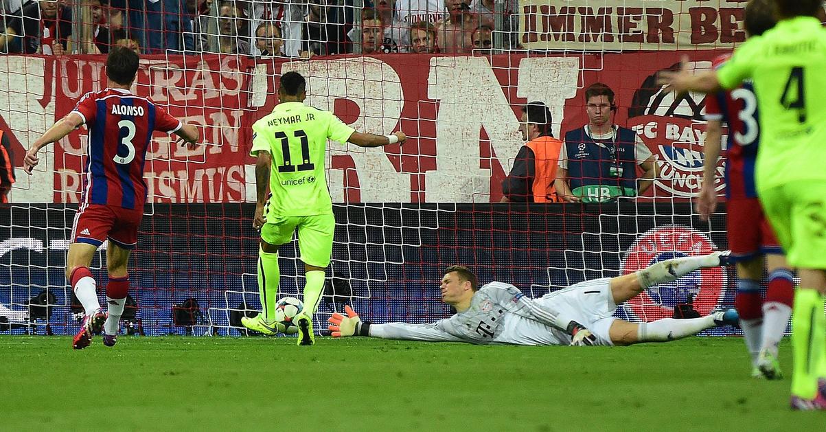 Gran noche de Neymar, que marcó dos goles en Múnich que a la postre resultaron decisivos. En la imagen, el brasileño bate a Manuel Neuer para firmar el 1-2 en el marcador.