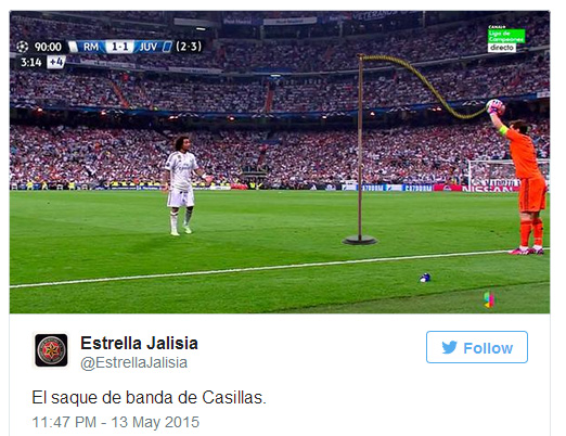 En los últimos instantes de la vuelta de las semifinales de la Champions entre Real Madrid y Juventus, Iker Casillas protagonizó una jugada que ha despertado numerosas burlas. Su equipo estaba a punto de caer eliminado y el portero decidió darse prisa para sacar de banda protagonizando un cómico momento cuando se le escapó el balón.