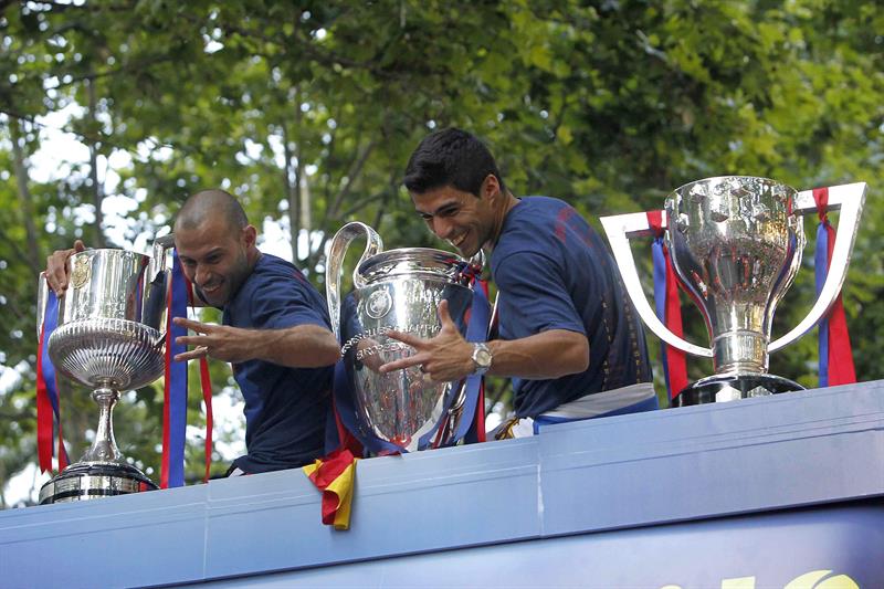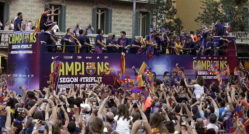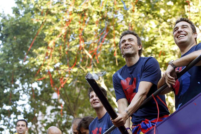Antes de la fiesta en el Camp Nou, el Barça se dio un baño de multitudes por las calles de la Ciudad Condal. Luis Enrique, que ha dicho que aún no sabe qué hará la próxima temporada, aparece en el autobús descapotable junto a uno de sus ayudantes en el staff técnico, el entrenador de porteros Juan Carlos Unzué.