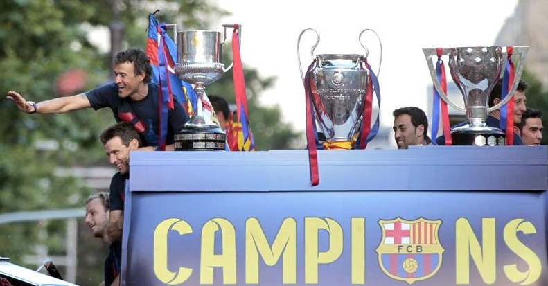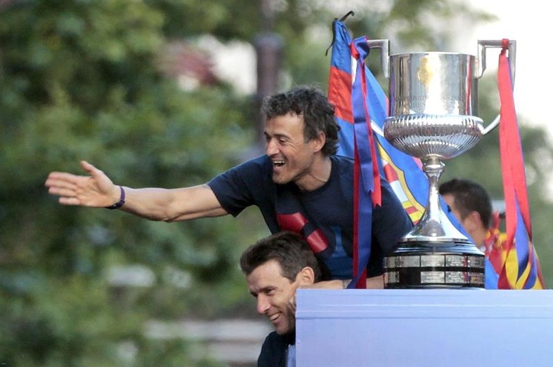 Luis Enrique, saludando a la afición culé desde el autobús descapotable.