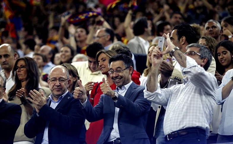 El presidente del Barcelona, Josep María Bartomeu (c), se lo pasó como un niño en las celebraciones.