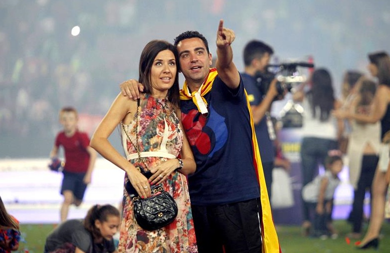 Xavi Hernández, especialmente emocionado después de haber vivido el sábado en Berlín sus últimos minutos con la camiseta azulgrana. En la imagen, el futbolista de Tarrasa junto a su mujer, Nuria Cunillera.